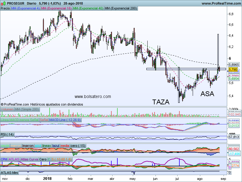 Prosegur no lleva un buen año. Desde que empezar 2018 en la zona de 6.8 ha ido bajando hasta caer casi un 25%. Sin embargo eso parece estar cambiando y ha tratado de superar la resistencia que se ha creado en 5.8 -5.9. Al hacer varios intentos ha desarrollado una figura de taza con asa que está cerca de activar. Se puede buscar una estrategia alcista para cuando consiga activarla.