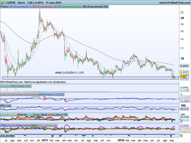 Codere lleva un mal 2018. Tras haber llegado a visitar 11 el valor se ha ido hundiendo poco a poco hasta llegar a la zona que ha servido de soporte en anteriores ocasiones. Esa zona ha supuesto importantes rebotes en el pasado y podría volver a suceder. El valor ha sido penalizado por su exposición en mercados emergentes donde sus divisas han caído entre otras cosas por lo que en principio no habría que buscar más que un rebote. En cualquier caso se puede proponer una estrategia alcista.
