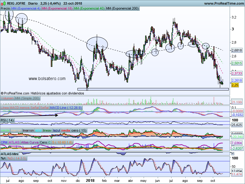 La estrategia en Reig Jofre pasaría por comprar a estos precios. El objetivo que habría que buscar estaría en 2.65 donde pasaría la media de largo plazo a la que tiene especial cariño. El stop debería ejecutarse si el precio perdiera 2.2 de manera clara. La relación Rentabilidad/riesgo permite hacer la operación.