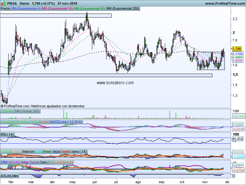 La estrategia en Prisa pasa por comprar a estos precios. El objetivo a buscar está en 2. El escenario habría que mantenerlo mientras no pierda 1,65. La relación Rentabilidad/riesgo permite hacer la operación.
